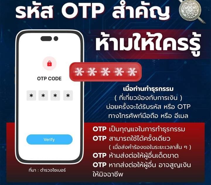 จำไว้!! ธนาคารไม่มีวันจะขอ OTP จากเราเด็ดขาด อย่าเชื่อหากมิจฉาชีพสวมรอยเป็นเจ้าหน้าที่ธนาคาร ขอ OTP ของท่าน